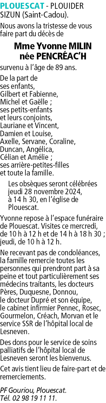 Décédée à Lesneven (29260, France) le lundi 25 novembre 2024 à l'âge de 89 ans