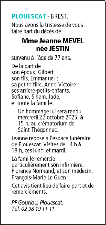 Décédée à Plouescat (29430, France) le vendredi 17 octobre 2025 à l'âge de 77 ans