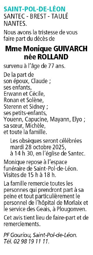 Décédée à Plougonven (29640, France) le jeudi 23 octobre 2025 à l'âge de 77 ans
