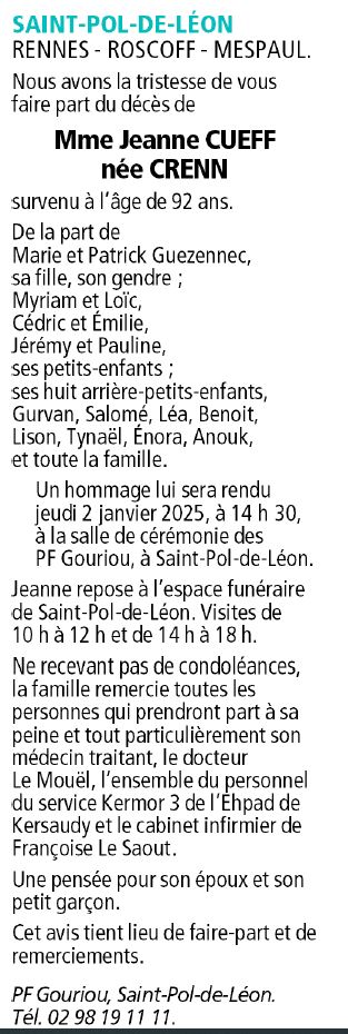 Décédée à Saint-Pol-de-Léon (29250, France) le dimanche 29 décembre 2024 à l'âge de 92 ans