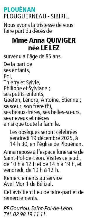 Décédée à Morlaix (29600, France) le mercredi 17 décembre 2025 à l'âge de 85 ans