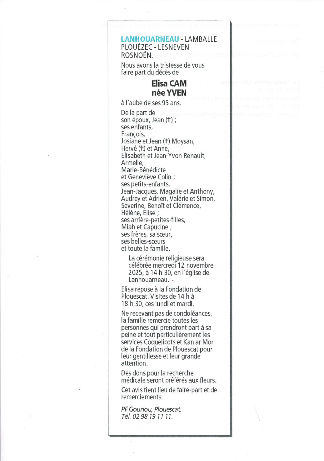 Décédée à Plouescat (29430, France) le dimanche 9 novembre 2025 à l'âge de 94 ans