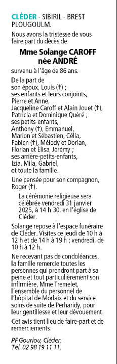 Décédée à Roscoff (29680, France) le mardi 28 janvier 2025 à l'âge de 86 ans