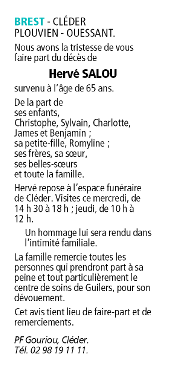 Décédé à Guilers (29820, France) le lundi 17 février 2025 à l'âge de 65 ans