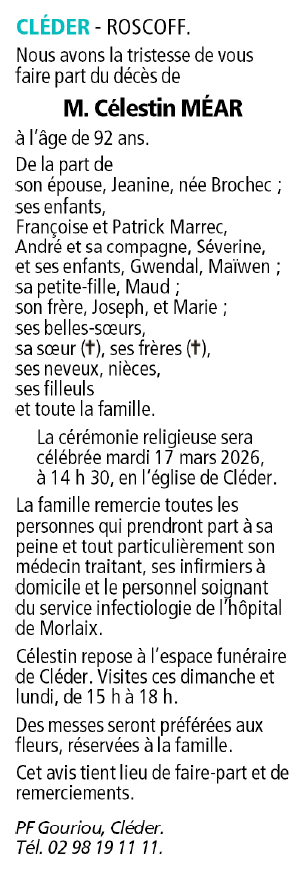 Décédé à Morlaix (29600, France) le vendredi 13 mars 2026 à l'âge de 92 ans