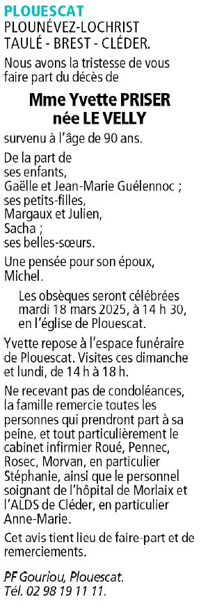 Décédée à Morlaix (29600, France) le vendredi 14 mars 2025 à l'âge de 90 ans