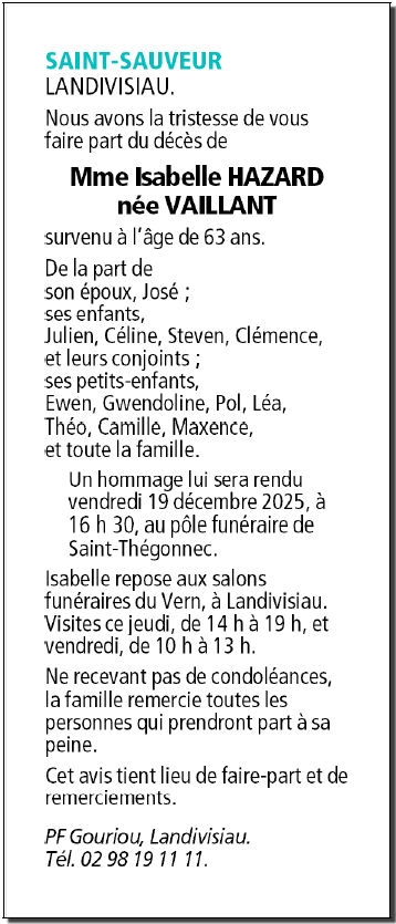 Décédée à Morlaix (29600, France) le mardi 16 décembre 2025 à l'âge de 63 ans