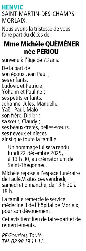 Décédée à Morlaix (29600, France) le mercredi 17 décembre 2025 à l'âge de 73 ans